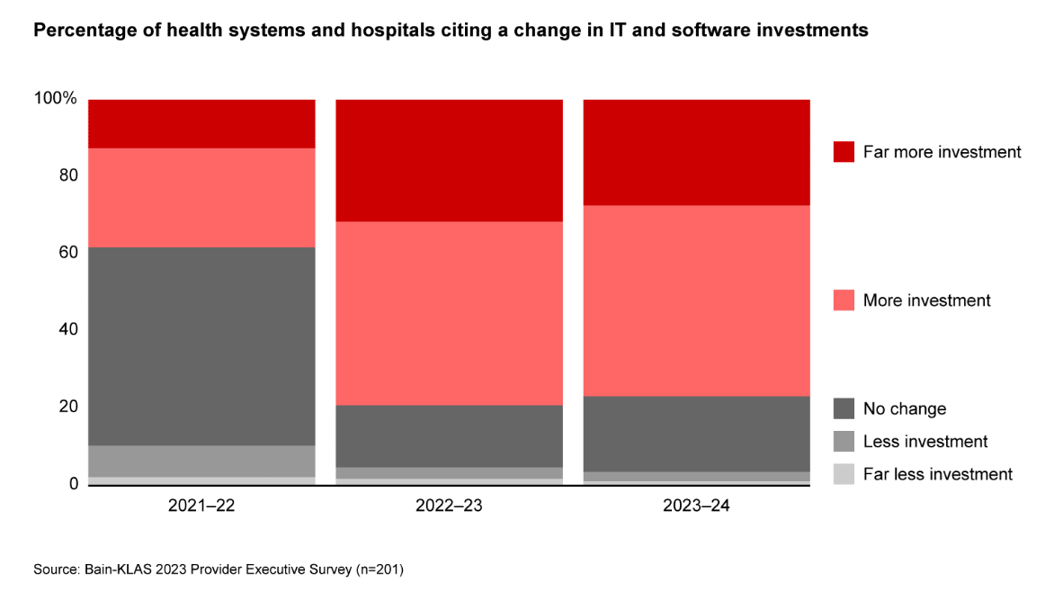 Bain & Co. published its 2023 Healthcare Provider IT Report: Doubling Down on Innovation report looking at health system IT departments are thinking about technology investments.